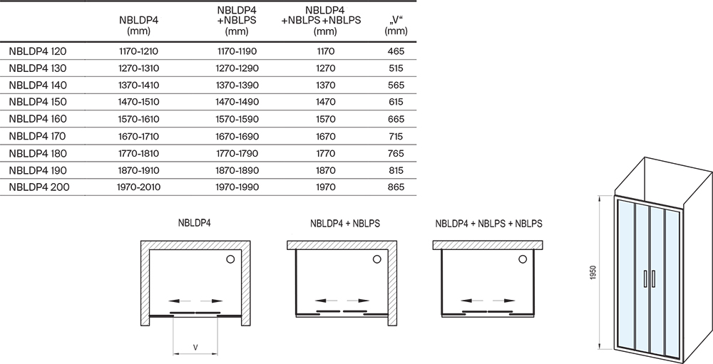 Výrobok tvorí jeden pevný diel. Montuje sa do obloženého rohu kúpeľne (v kombinácii so sprchovými dverami NBLDP2 / NBLDP4) na vaničky Ravak Perseus Pro, Perseus Pro Flat, Perseus Pro Chrome, Gigant Pro, Gigant Pro Flat, Gigant Pro Chrome alebo priamo na podlahu so zabudovaným odtokovým žľabom či podlahovým vpustom. Pevná stena nie je určená na samostatné použitie. Kombináciou sprchových dverí s dvoma pevnými stenami typu NBLPS vytvoríte sprchový kút v tvare „U“.