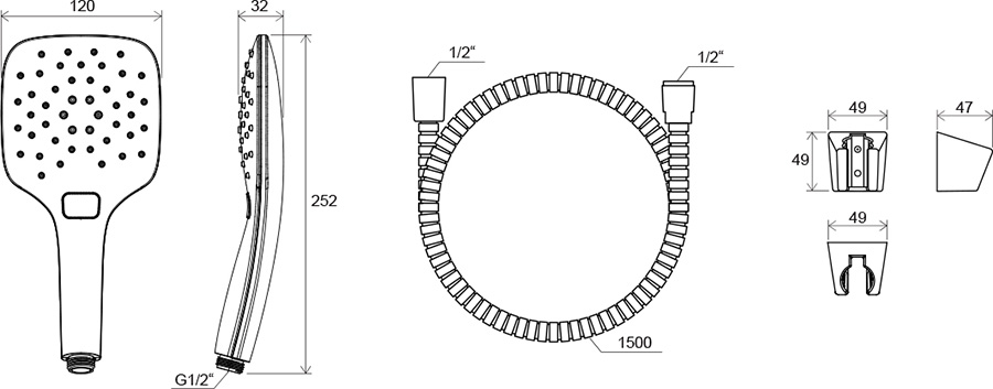 Vanový set obsahujúci ručnú sprchu, hadicu a malý držiak.