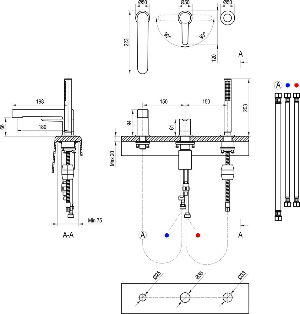 Stojanková batéria sa skladá z troch zladených komponentov: ramená na napúšťanie, ručnej sprchy a páky, ktorá medzi nimi prepína a nastavuje teplotu. Prúd je stabilný. Inštaluje sa priamo do okraja vane alebo do desky za vaňou. Hadica sprchy tak neprekáža počas kúpania.